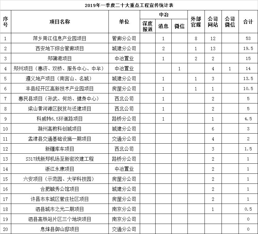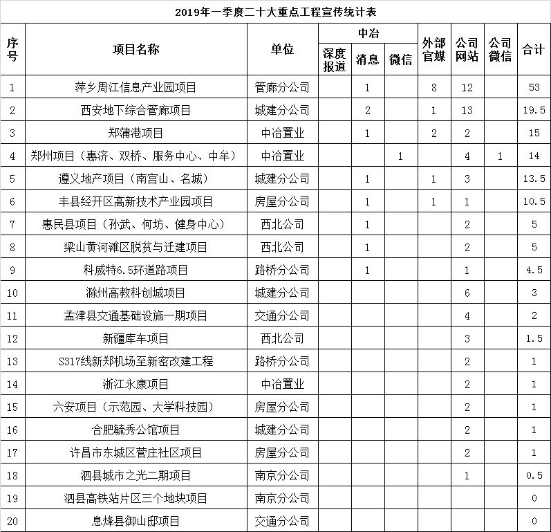 2019年一季度二十大重點工程宣傳統計表
