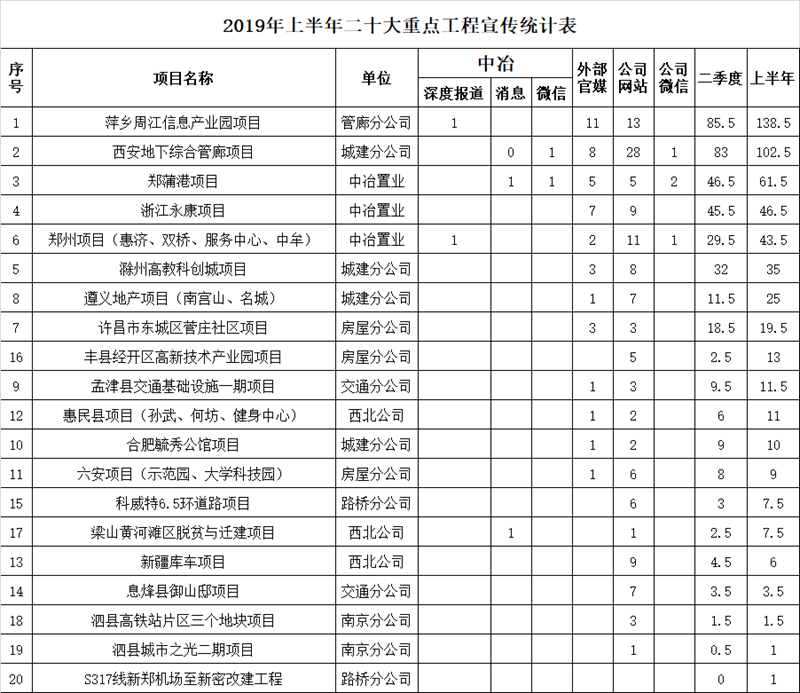 2019年上半年二十大重點工程宣傳統計表