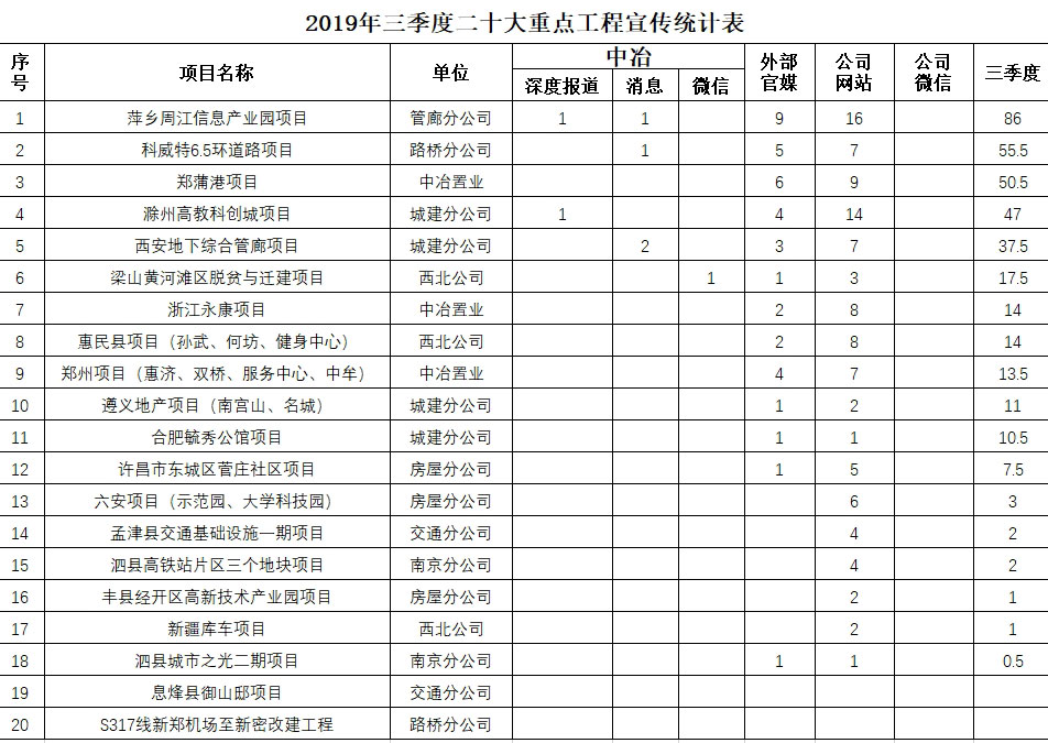 2019年三季度二十大重點工程宣傳統(tǒng)計表