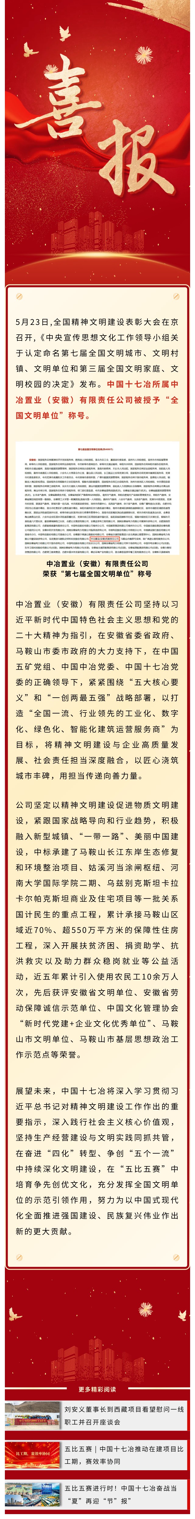 喜報!中冶置業(安徽)有限責任公司榮膺“全國文明單位”
