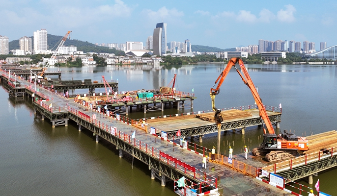 蹄疾步穩開新局,活力迸發加速跑。趁著春節期間堅守崗位的大干氛圍,建安分公司承建的黃石磁湖綠色廊道工程全面吹響復工“集結號”,各種機械、施工人員在鋼棧橋上來回穿梭,呈現出“大干快干”的火熱場景。