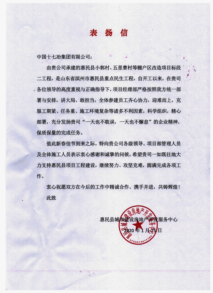 1月15日,山東省濱州市惠民縣城市建設(shè)房地產(chǎn)開發(fā)服務(wù)中心向中國十七冶集團(tuán)發(fā)來表揚(yáng)信,對十七冶承建的小郭村、五里曹村等棚戶區(qū)改造項(xiàng)目標(biāo)段二工程保質(zhì)保量完成任務(wù)提出表揚(yáng),同時(shí)在新春來臨之際對十七冶各級領(lǐng)導(dǎo)及全體管理人員表示衷心感謝和誠摯問候。