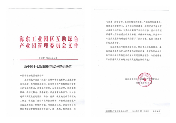 表揚信中指出,項目自開工建設以來,十七冶項目部統一思想、科學組織、周密安排,主動克服各種困難,嚴格落實標準要求,狠抓工程質量安全,全力推動項目建設,順利完成施工節點各項目標任務。十七冶在項目建設過程中表現出無私奉獻、頑強拼搏的施工風范和一心為業主服務的理念給我留下了深刻印象,贏得了地方各界的高度贊譽。同時也希望十七冶在今后的工作中繼續保持優良的施工風范及服務理念,為互助綠色產業園建設及互助地方經濟發展做出新的貢獻。