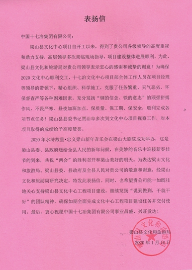 1月18日,梁山縣文化和旅游局向中國十七冶集團發來表揚信,對十七冶山東分公司順利完成梁山縣文化中心工程各施工節點,及公司領導對該項目的高度重視、項目部全體人員的辛勤付出表示感謝。