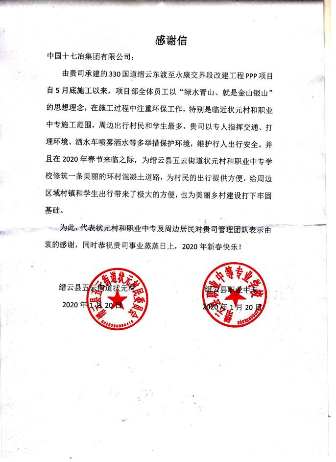 1月20日,縉云縣五云街道狀元村民委員會、職業中等專業學校向中國十七冶集團有限公司發來感謝信,感謝路橋工程技術分公司330國道縉云東渡至永康交界段改建工程PPP項目部為狀元村和職業中等專業學校修筑了一條美麗的環村混凝土道路,為村民和學生的出行提供了極大的便利。