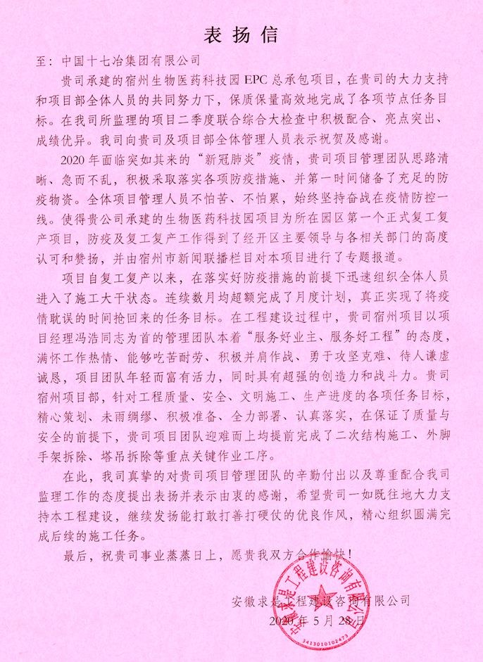 表揚信稱,宿州生物醫藥科技園項目在中國十七冶集團的大力支持和項目部全體管理人員的共同努力下,保質保量且高效的完成了各項節點任務目標。在其所監理的項目二季度聯合綜合大檢查中積極配合、亮點突出、成績優異。尤其是進入新年度以來,面對突如其來的新冠肺炎疫情,項目管理團隊思路清晰,積極采取落實各項防疫措施,作為園區首個復產復工項目,防疫工作得到經開區主要領導與相關部門的高度認可并在宿州市新聞媒體進行了專題報道。項目復產復工以來,在落實好防疫措施的前提下迅速組織全體成員進入大干狀態,連續數月超額完成月度計劃。在保證質量與安全的前提下完成了二次結構施工、外腳手架拆除、塔吊拆除等關鍵作業工序。本著服務好業主、服務好工程的態度,項目部全體成員滿懷熱情、能夠吃苦耐勞,勇于攻堅克難,團隊年輕且富有活力,具有超強的創造力和戰斗力。