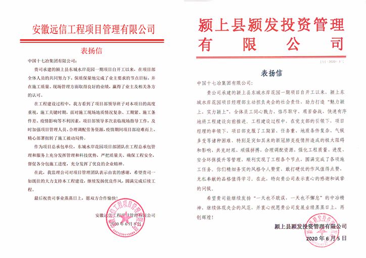 6月8日和10日,安徽遠信工程項目管理有限公司和潁上縣潁發投資管理有限公司分別向中國十七冶集團致表揚信,對中國十七冶集團在承建潁上縣東城水岸花園一期項目中精細務實的風格與敢打硬仗的作風給予了高度贊揚。
