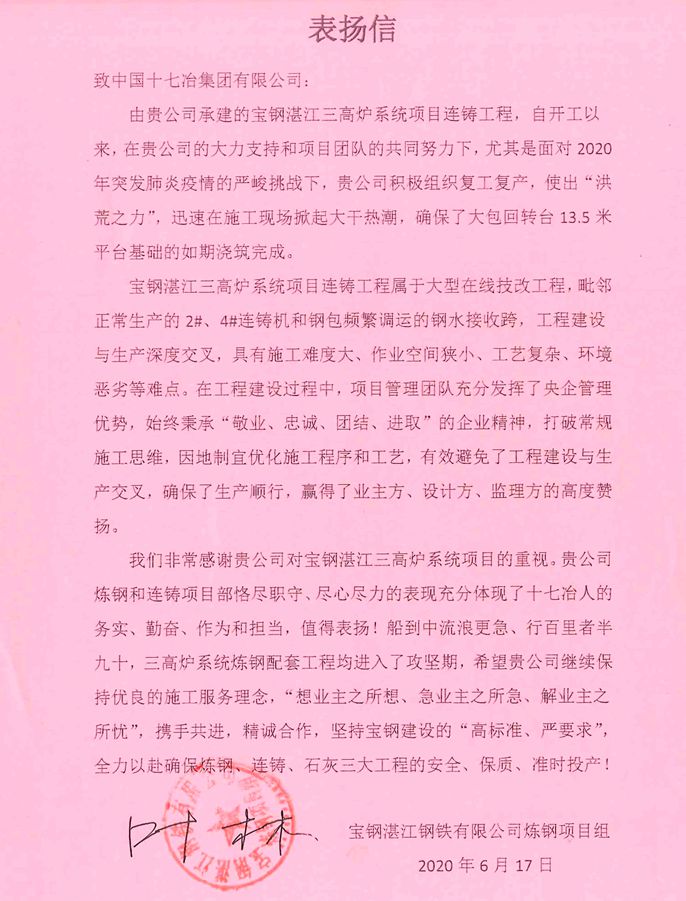 6月19日,寶鋼湛江鋼鐵有限公司煉鋼項目組向中國十七冶集團發來表揚信,對中國十七冶集團冶金工程技術分公司寶鋼湛江鋼鐵連鑄項目部積極推動工作有序開展、按期完成施工任務提出表揚。