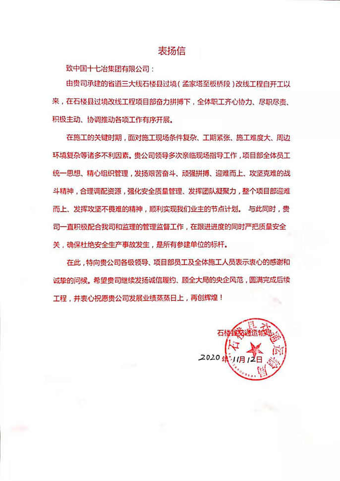 11月12日,山西省石樓縣交通運輸局向中國十七冶集團致表揚信,對市政工程技術分公司石樓縣過境改線工程項目部誠信履約、高效施工提出表揚。