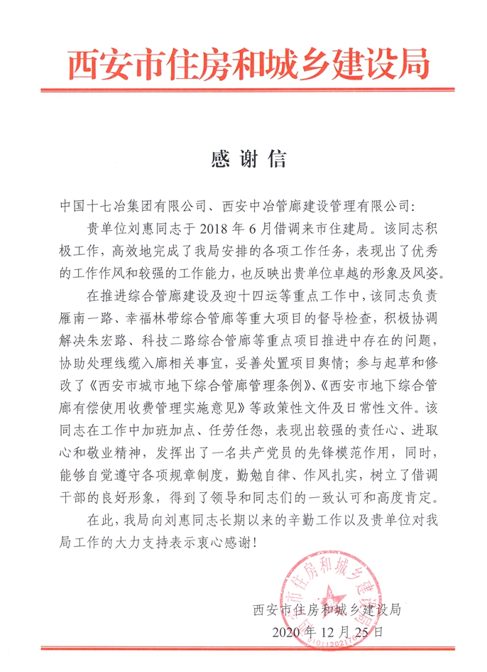 12月25日,西安市住房和城鄉(xiāng)建設(shè)局向中國(guó)十七冶集團(tuán)公司發(fā)出感謝信,對(duì)十七冶陜西分公司員工劉惠同志長(zhǎng)期以來(lái)的辛勤工作以及十七冶集團(tuán)對(duì)住建局工作的大力支持表示衷心感謝。
