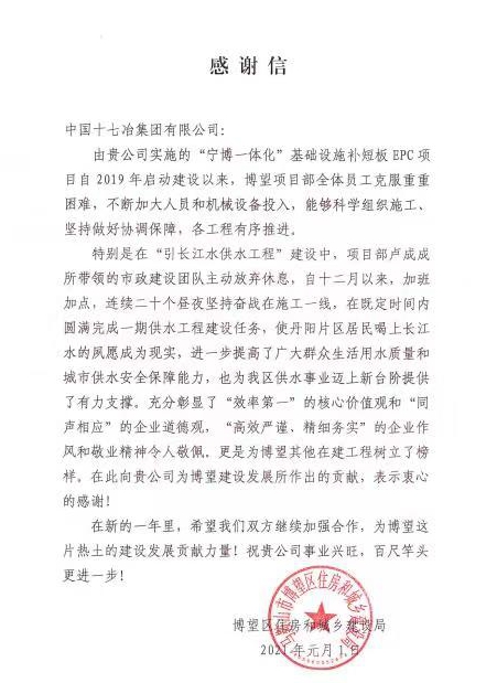 博望區(qū)住建局在感謝信中表示,項(xiàng)目部盧成成團(tuán)隊(duì)在“引長(zhǎng)江水供水工程”建設(shè)中,連續(xù)二十個(gè)晝夜堅(jiān)持奮戰(zhàn)在施工一線,在既定時(shí)間內(nèi)圓滿完成一期供水工程建設(shè)任務(wù),進(jìn)一步提高了廣大群眾生活用水質(zhì)量和城市供水安全保障能力,為博望區(qū)供水事業(yè)邁上新臺(tái)階提供了有力支撐。稱(chēng)贊十七冶團(tuán)隊(duì)是博望其他在建工程的榜樣,并希望在新的一年能夠繼續(xù)加強(qiáng)合作,共同建設(shè)好博望這片熱土。