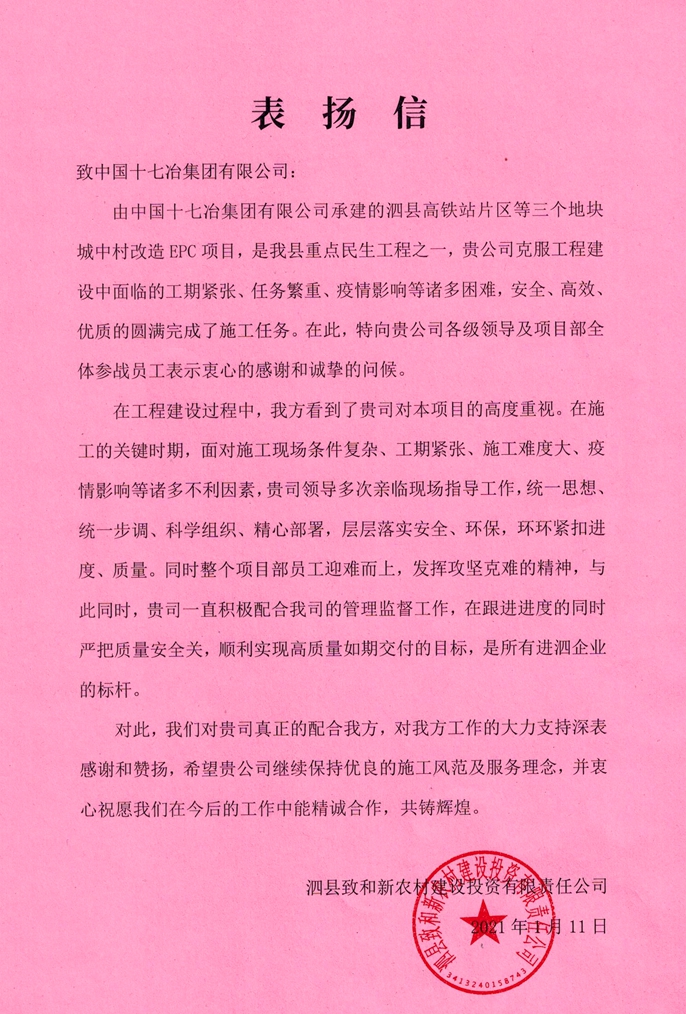 1月11日,泗縣致和新農(nóng)村建設(shè)投資有限責(zé)任公司向中國十七冶集團(tuán)致表揚(yáng)信,對南京分公司圓滿完成泗縣高鐵站片區(qū)等三個地塊城中村改造施工任務(wù)提出表揚(yáng)。