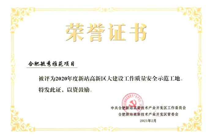 2月27日,在合肥新站高新區大建設工作表彰大會上,中國十七冶集團承建的毓秀雅苑項目獲評“質量安全示范工地”榮譽稱號。