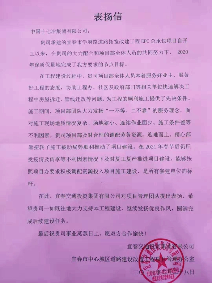 2月28日,宜春交通投資集團有限公司致信中國十七冶集團,表揚管廊工程技術分公司宜春市學府路道路拓寬改建工程EPC總承包項目團隊。