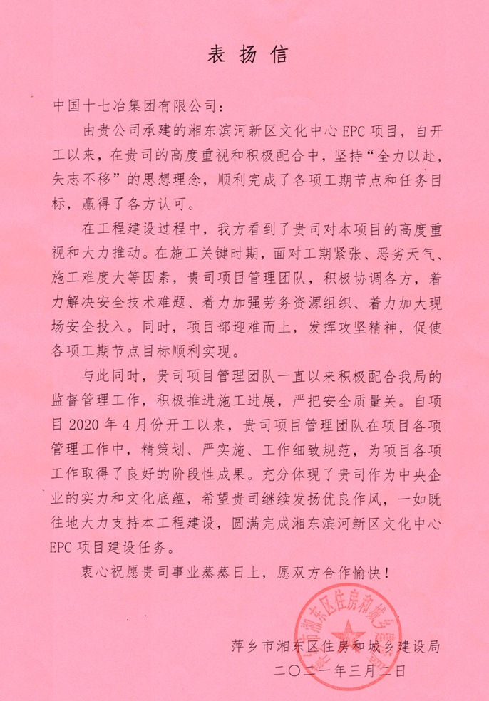 3月2日,萍鄉市湘東區住建局向十七冶致表揚信,對管廊分公司承建的湘東濱河新區文化中心項目部開展的各項工作給予了充分的肯定。