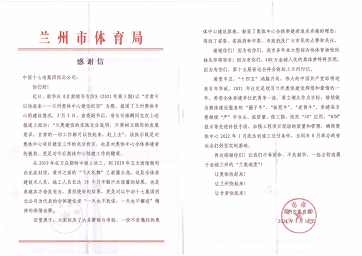 3月15日,蘭州市體育局向十七冶西北公司致感謝信,對蘭州奧體中心項目建設的各項工作給予了充分的肯定。