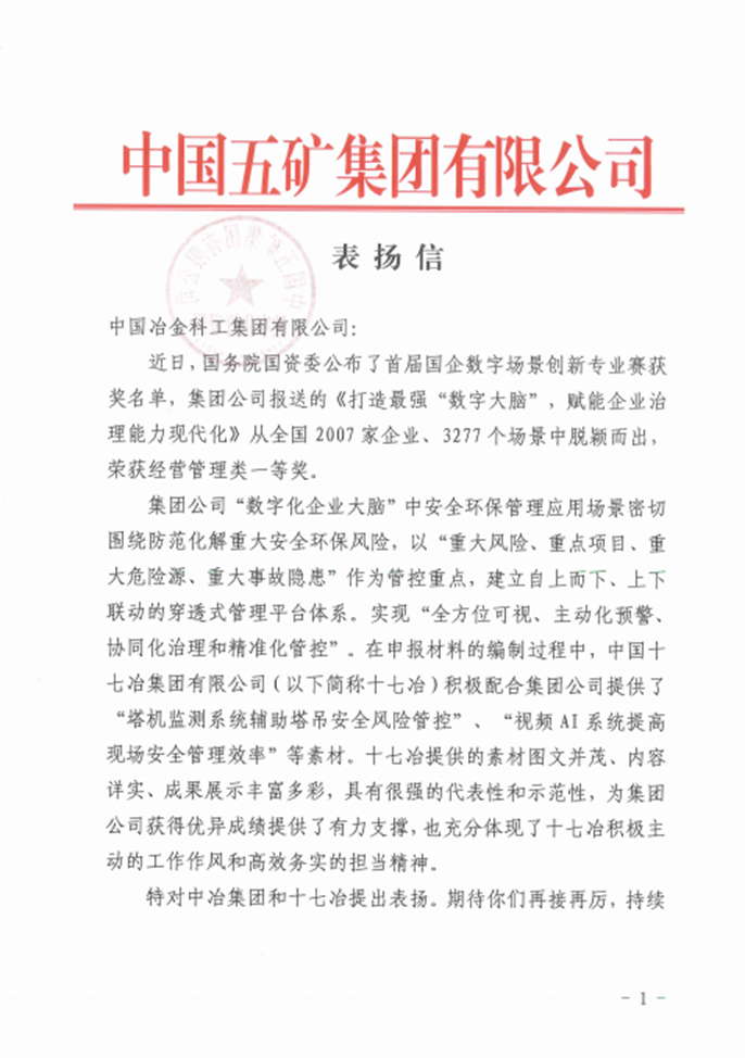 近日,中國五礦數字化管理部向中冶集團致表揚信,對中國十七冶在中國五礦參加國資委首屆國企數字場景創新專業賽中,以高質量的成果展示和豐富素材,為中國五礦獲得優異成績貢獻了重要力量給予表揚。