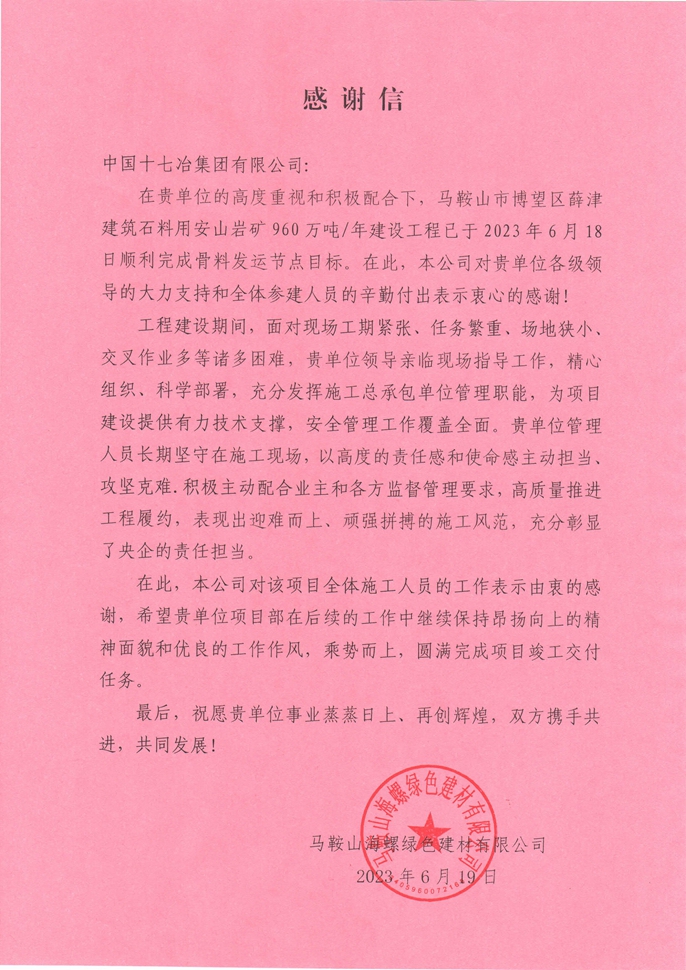 6月28日,馬鞍山海螺綠色建材公司向中國十七冶集團發來感謝信,對馬鞍山海螺綠色建材項目團隊克服種種困難,于6月18日順利完成工程骨料發運節點目標表示衷心感謝。