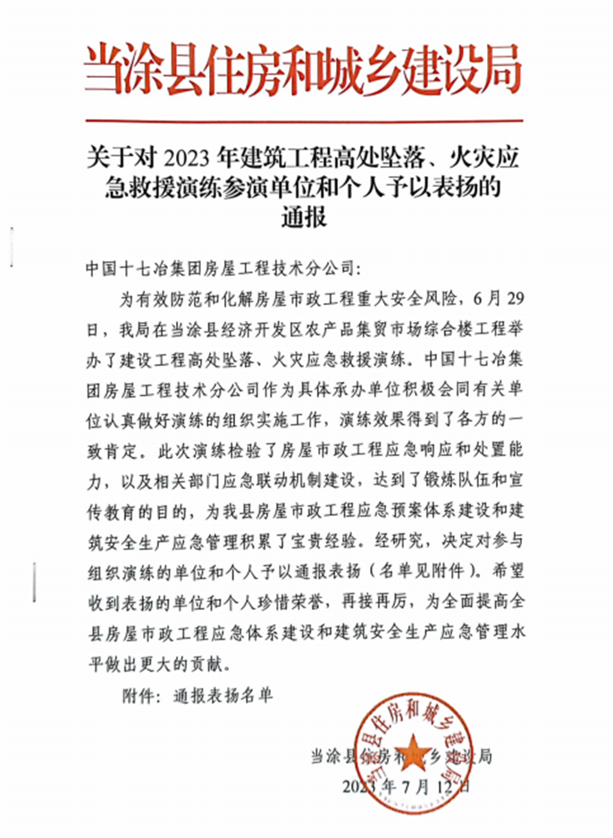 7月12日,當涂縣住房和城鄉建設局下發通知,對中國十七冶房屋分公司為日前住建局舉辦的建設工程高處墜落、火災應急救援演練所做積極貢獻表示高度贊揚。