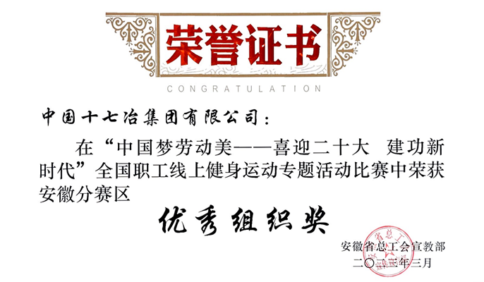 日前,從安徽省總工會獲悉,在“中國夢·勞動美——喜迎二十大 建功新時代”全國職工線上健身運動專題活動比賽中,中國十七冶集團(tuán)榮獲安徽分賽區(qū)優(yōu)秀組織獎,冶金分公司職工張來進(jìn)榮獲個人排名獎三等獎。