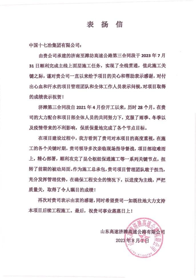 8月2日,山東高速濟濰高速有限公司向中國十七冶集團致表揚信,對交通分公司濟濰高速三標項目團隊攻堅克難、勇毅前行,于7月31日優質高效實現全線貫通這一關鍵節點表示感謝。
