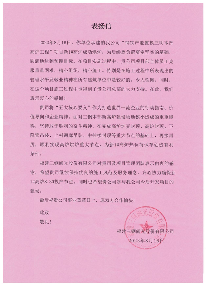 8月16日,福建三鋼閩光股份有限公司向中國十七冶集團(tuán)致表揚(yáng)信,對冶金分公司福建三明三鋼項(xiàng)目團(tuán)隊(duì)如期完成新1#高爐烘爐節(jié)點(diǎn)表示由衷的感謝。