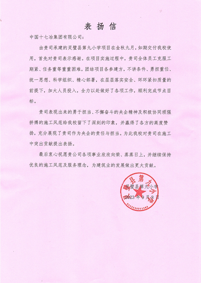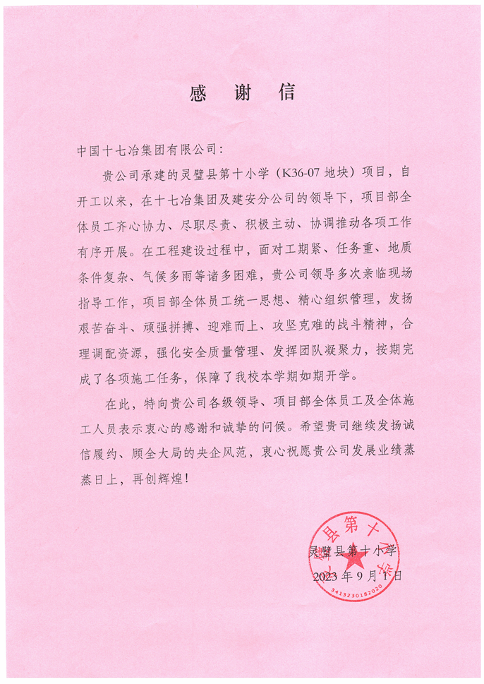 近日,靈璧縣第九小學(xué)、第十小學(xué)分別向中國(guó)十七冶集團(tuán)致表?yè)P(yáng)信與感謝信,對(duì)建安分公司靈璧小學(xué)項(xiàng)目部按期完成各項(xiàng)施工任務(wù),保障學(xué)校如期開(kāi)學(xué)表示感謝。