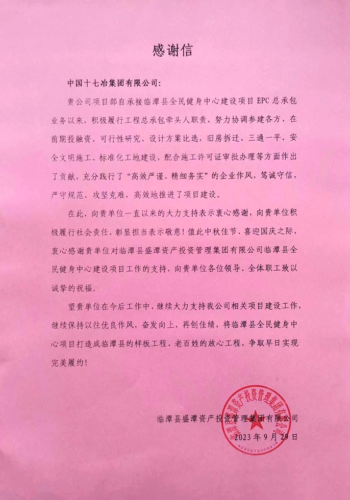 9月29日,臨潭縣盛潭資產(chǎn)投資管理集團有限公司向中國十七冶集團致感謝信,對臨潭全民健身中心項目團隊積極推進項目建設(shè)表示肯定與感謝。