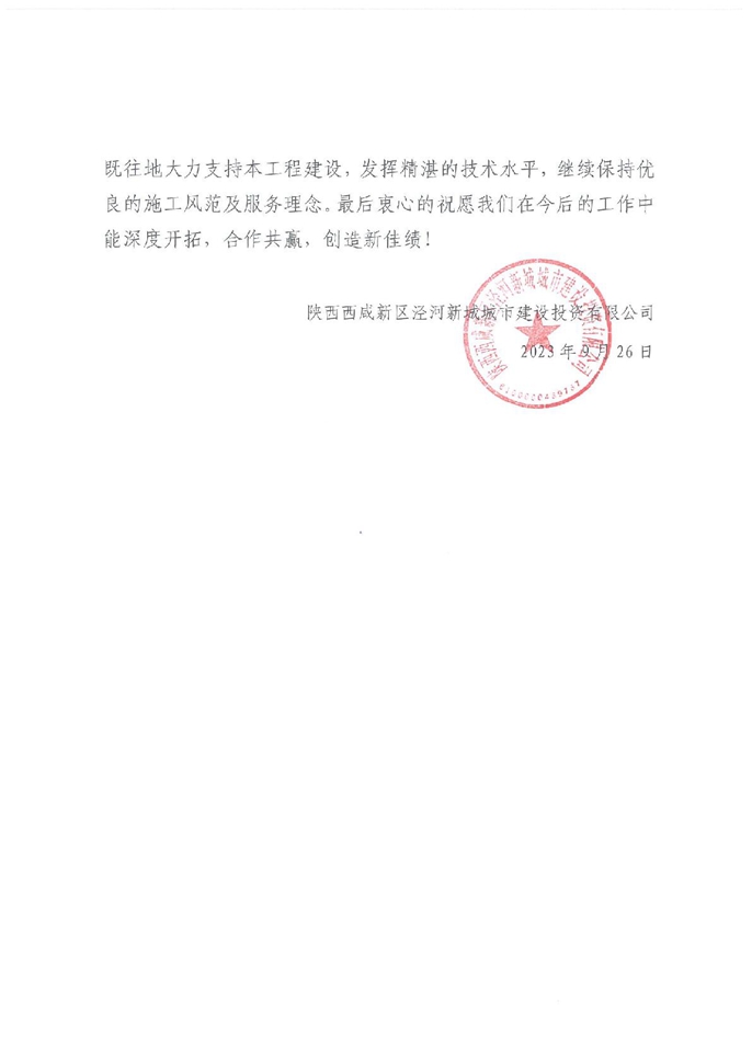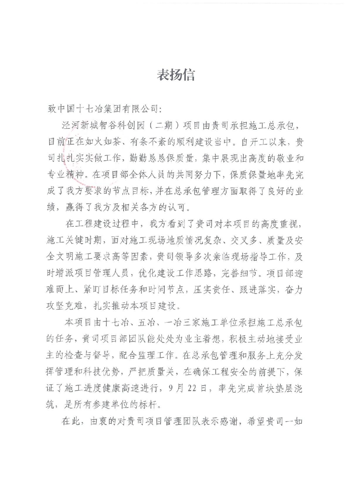 十一前夕,陜西西咸新區涇河新城城市建設投資有限公司向中國十七冶集團致表揚信,對陜西分公司涇河新城智谷科創園項目團隊克服困難,率先完成既定節點表示肯定與感謝。