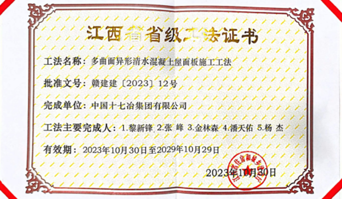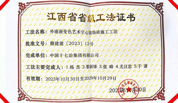 近日,從江西省住建廳獲悉,中國十七冶工建分公司景德鎮藝術職業大學項目部申報的《多曲面異形清水混凝土屋面板施工工法》《外墻漸變色藝術空心裝飾磚施工工法》2項成果被評定為江西省工程建設2023年度第一批省級工法。