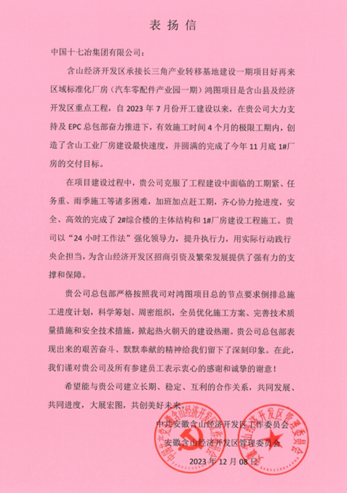 12月11日,中共安徽含山經濟開發區工作委員會、安徽含山經濟開發區管理委員會向中國十七冶致表揚信,對路橋分公司含山經開區鴻圖新能源汽車輕量化鑄件項目團隊創造含山廠房建設最快速度,圓滿完成11月底1#廠房交付目標提出表揚。