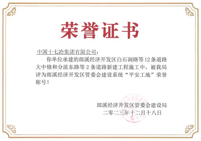 12月18日,中國十七冶路橋分公司承建的郎溪經開區白石澗路等12條道路大中修和分流東路等2條道路新建工程獲授“郎溪經開區管委會建設系統‘平安工地’”。