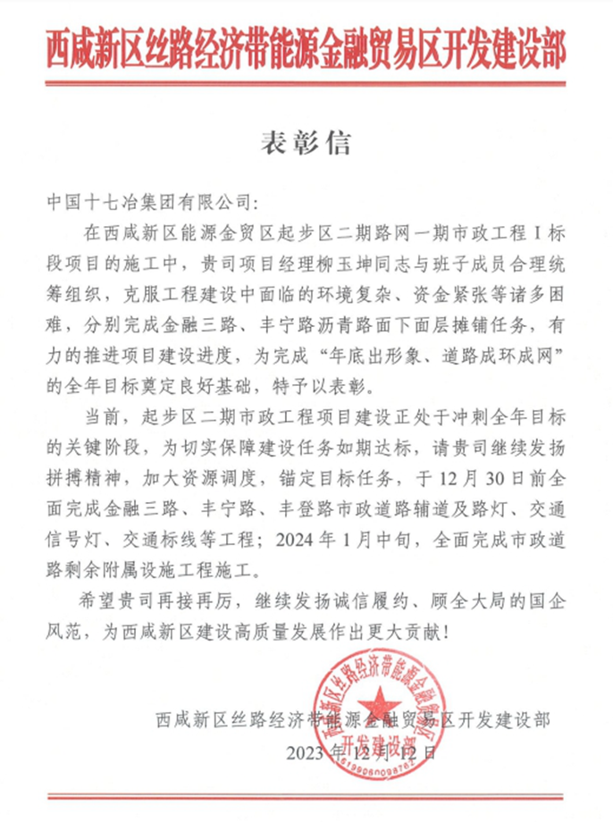 12月20日,西成新區絲路經濟帶能源金融貿易區開發建設部向中國十七冶致表彰信,對路橋分公司西咸新區能源金貿區起步區二期路網一期市政工程I標段項目團隊高效推進項目進度提出表揚。