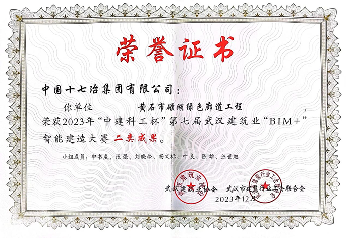 12月21日,2023年湖北省住建行業職業技能競賽暨“中建科工杯”第七屆武漢建筑業“BIM+”智能建造大賽發布獲獎名單,中國十七冶黃石EOD項目磁湖綠色廊道工程申報的《BIM+GIS+IOT數字化集成應用》從166個優質項目脫穎而出,榮獲二類成果。