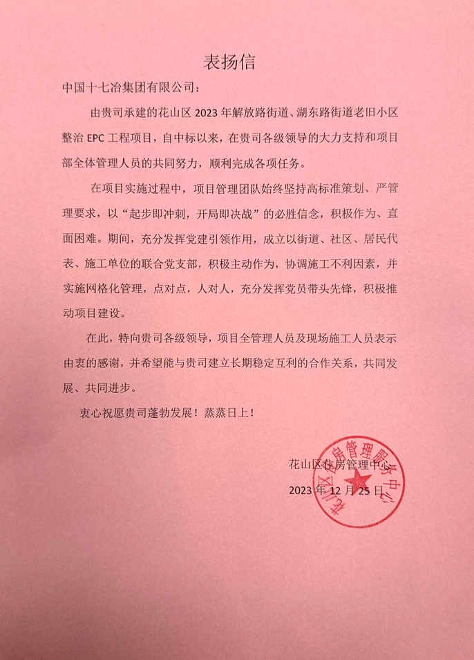 12月26日,馬鞍山市花山區住房管理中心向中國十七冶致表揚信,對南京分公司花山區2023年解放路街道、湖東路街道老舊改項目團隊于12月20日如期圓滿完成各項改造任務提出表揚。