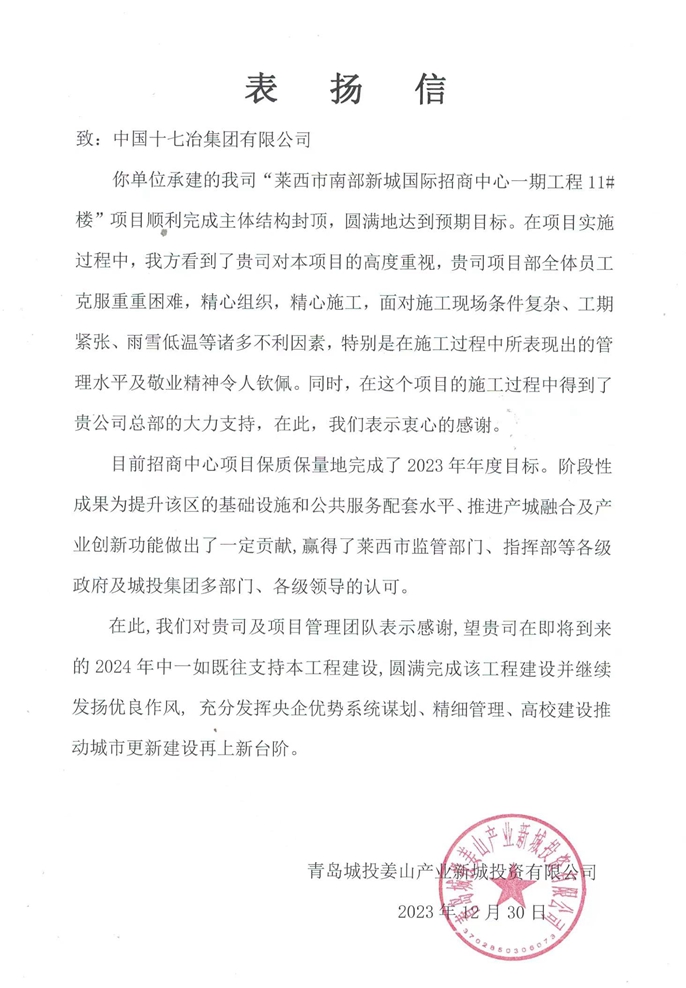 近日,青島城投姜山產業新城投資有限公司向中國十七冶集團致表揚信,對青島分公司萊西南部新城國際招商中心(一期)項目團隊如期實現封頂目標,圓滿完成年度各項建設任務提出表揚。