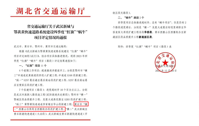 近日,湖北省交通廳發(fā)布武漢新城與鄂黃黃快速道路系統(tǒng)建設(shè)四季度“紅旗”項目評定情況,對項目進(jìn)度超前、快速推進(jìn)提出表揚(yáng),中國十七冶黃石大道拓寬及生態(tài)改造項目西塞山住保局至西塞街辦段改擴(kuò)建工程成為11個入選的“紅旗”項目之一。