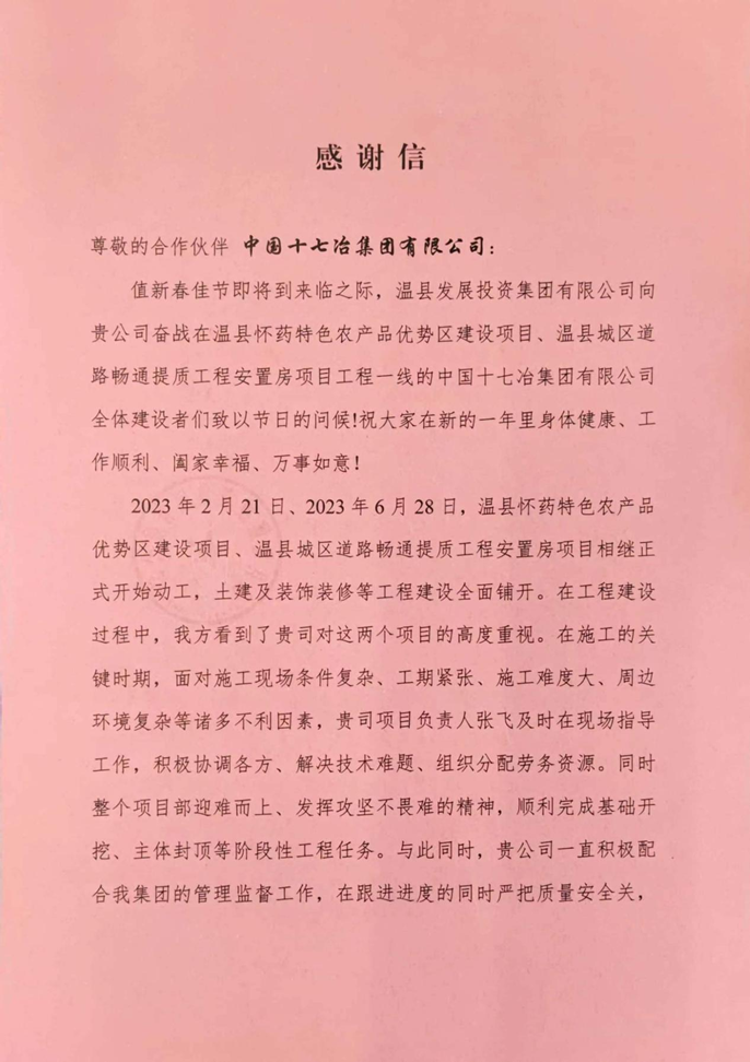 1月26日,溫縣發展投資集團有限公司向中國十七冶集團有限公司致感謝信,對中國十七冶積極配合業主工作、實現承建項目高質量履約所做出的重要貢獻表示衷心感謝。