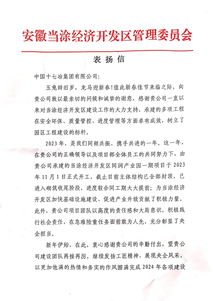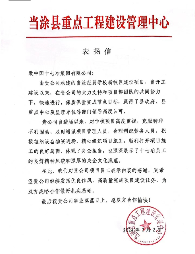 近日,當(dāng)涂縣教育局、縣經(jīng)開區(qū)管委會(huì)、縣重點(diǎn)工程建設(shè)管理中心先后向中國(guó)十七冶集團(tuán)致表?yè)P(yáng)信,對(duì)公司當(dāng)涂片區(qū)項(xiàng)目高效完成2023年度建設(shè)任務(wù)提出表?yè)P(yáng)并致以感謝。