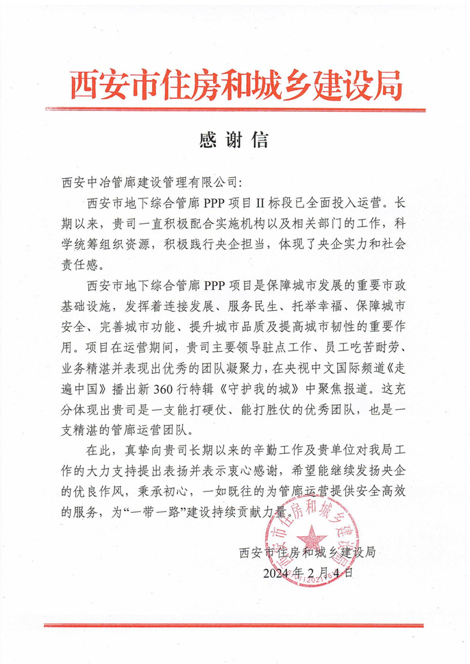 2月4日,西安市住建局向西安中冶管廊建設(shè)管理有限公司致感謝信,對(duì)項(xiàng)目公司長(zhǎng)期以來(lái)的辛勤工作及支持表示衷心感謝。
