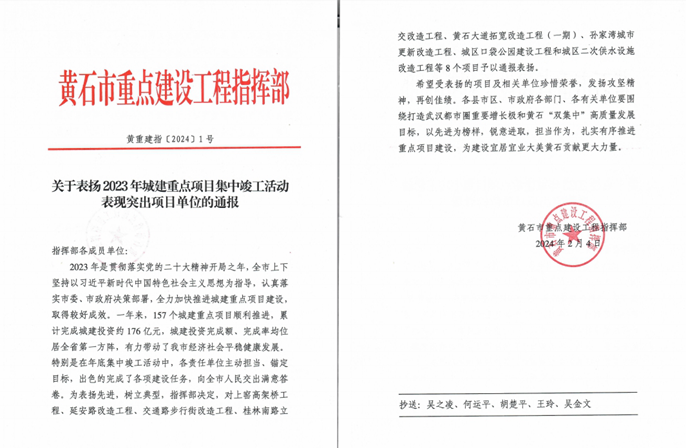 2月4日,黃石市重點建設工程指揮部發布《關于表揚2023年城建重點項目集中竣工活動表現突出項目黨委的通報》,為表揚先進,樹立典型,對黃石大道拓寬改造工程(一期)等8個項目予以通報表揚。