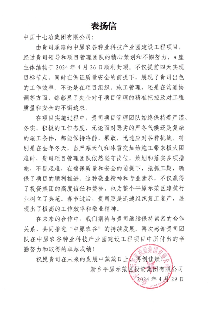 近日,新鄉平原示范區投資集團向中國十七冶集團致表揚信,對冶金分公司高效完成中原農谷種業科技產業園首棟單體封頂節點給予肯定。