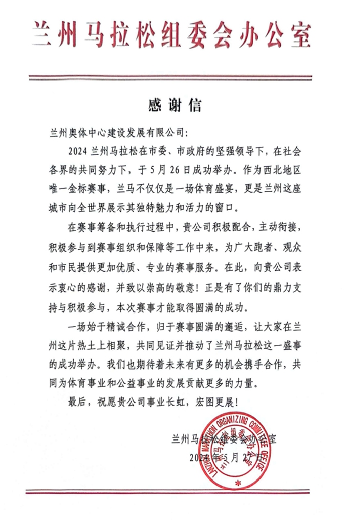 5月27日,蘭州馬拉松組委會辦公室向蘭州奧體中心建設發展有限公司致感謝信,對項目公司積極參與賽事組織保障工作,為廣大跑者、觀眾和市民提供更加優質、專業的賽事服務致以誠摯感謝,給予高度認可。