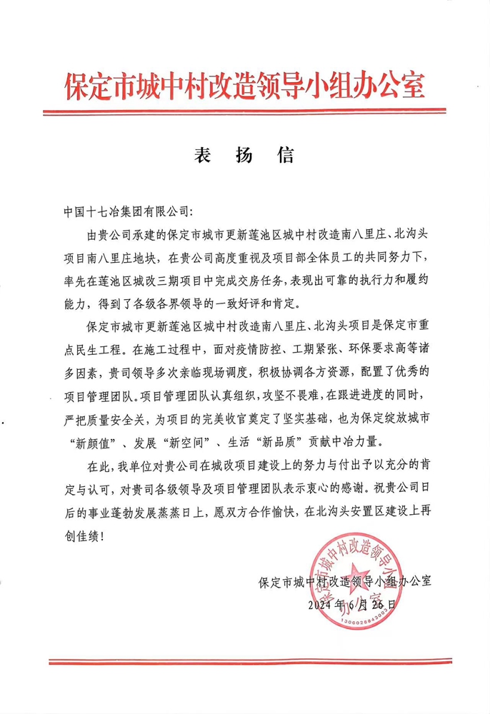 6月26日,保定市城中村改造領導小組辦公室向中國十七冶集團致表揚信,對房屋分公司保定市城改七標段團隊在蓮池區三期項目中率先完成交房任務,表現出的可靠執行力和履約能力給予好評和肯定。