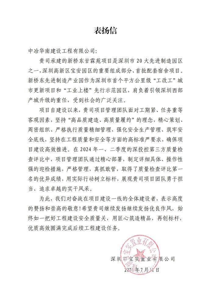近日,深圳市寶實置業有限公司向中冶華南建設投資有限公司致表揚信,對新橋東片區城市更新片區項目——甘霖苑項目部在2024年一、二季度第三方質量檢查評比中取得第一名的優異成績給與肯定。