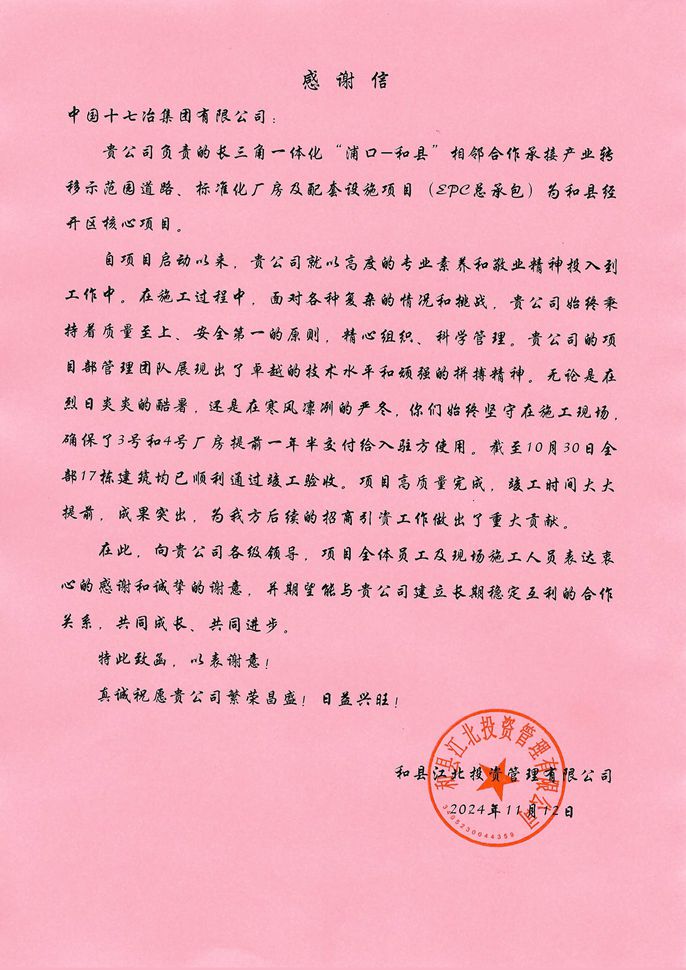11月12日,和縣江北投資管理有限公司向中國十七冶集團致感謝信,對市政分公司項目團隊順利完成和縣浦和示范區道路、標準化廠房及配套設施建設任務表示感謝。
