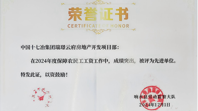 近日,中國十七冶響水瑞璟云府房地產開發項目部獲評響水縣保障農民工工資支付工作“先進單位”。