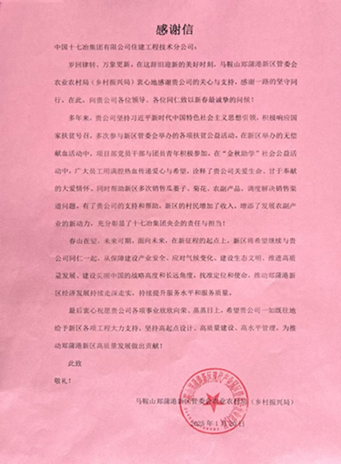 1月20日,馬鞍山鄭蒲港新區管委會農業農村局(鄉村振興局)向中國十七冶集團致感謝信,對十七冶長期以來支持鄭蒲港新區民生工作表達衷心感謝。