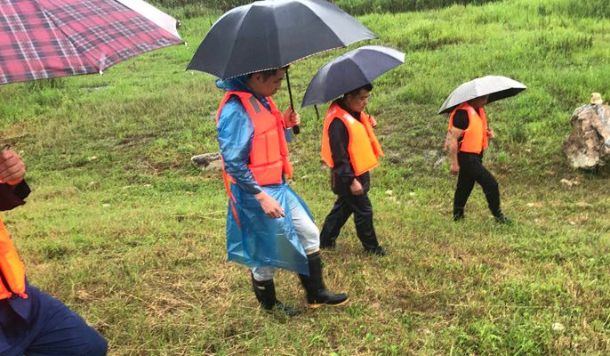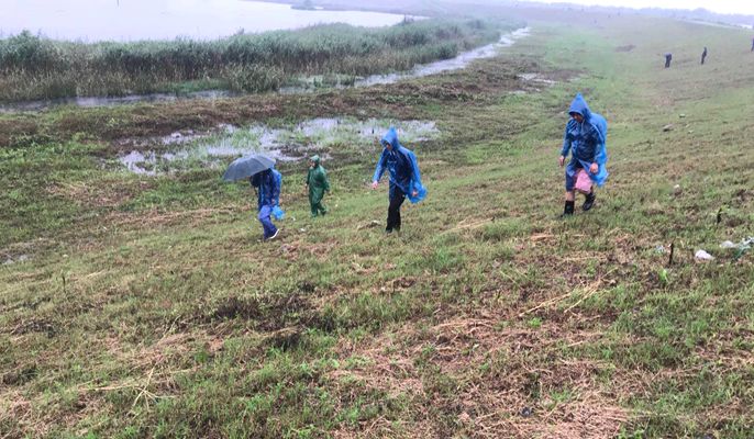 隊(duì)員們冒雨行走在泥濘的背水坡上,五人一組站成一排,逐段逐段的仔細(xì)巡查著坡面,每隔一個(gè)小時(shí)進(jìn)行一次排查,不大意不松懈,不錯(cuò)過任意一個(gè)可能發(fā)生滲漏的點(diǎn)。薄底的膠鞋走在堆滿各類尖銳石子的背水坡,腳底生疼,但大家都咬牙堅(jiān)持,腳底磨出一個(gè)個(gè)水泡。累了大家就在橋洞底、路邊的臨時(shí)休息點(diǎn)休息一會(huì),簡(jiǎn)單的吃個(gè)午飯,繼續(xù)巡查。