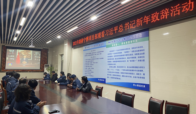 博望區“寧博一體化”項目管理部組織全體職工集中觀看了習近平主席發表2021年新年賀詞,回顧“用眾志成城、堅忍不拔書寫的抗疫史詩”,展望“全面建設社會主義現代化國家新征程”。習近平主席的新年賀詞描繪了這一年中國人民波瀾壯闊的奮斗畫卷,溫暖人心、令人振奮。大家表示在新的一年,要繼續奮斗,勇往直前,創造更加燦爛的輝煌,以優異成績慶祝中國共產黨成立100周年。隨后項目部還舉行了抽獎活動,在歡聲笑語中共同迎接2021年的到來。